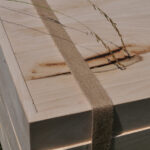 Ik maakte Sanne’s kist van twee machtige delen Lindehout. Verzaagd, geschaafd en geschuurd tot 7 houten kaders. Ieder kader een centimeter hoger dan de ander. Leven is groeien, leven is grillig. Om bij zijligging nog wel haar gezicht te kunnen zien bij een open kist hield ik de onderkant van de kist laag. Drie juten banden trekken bij het dragen van de kist de deksel op de onderkant.